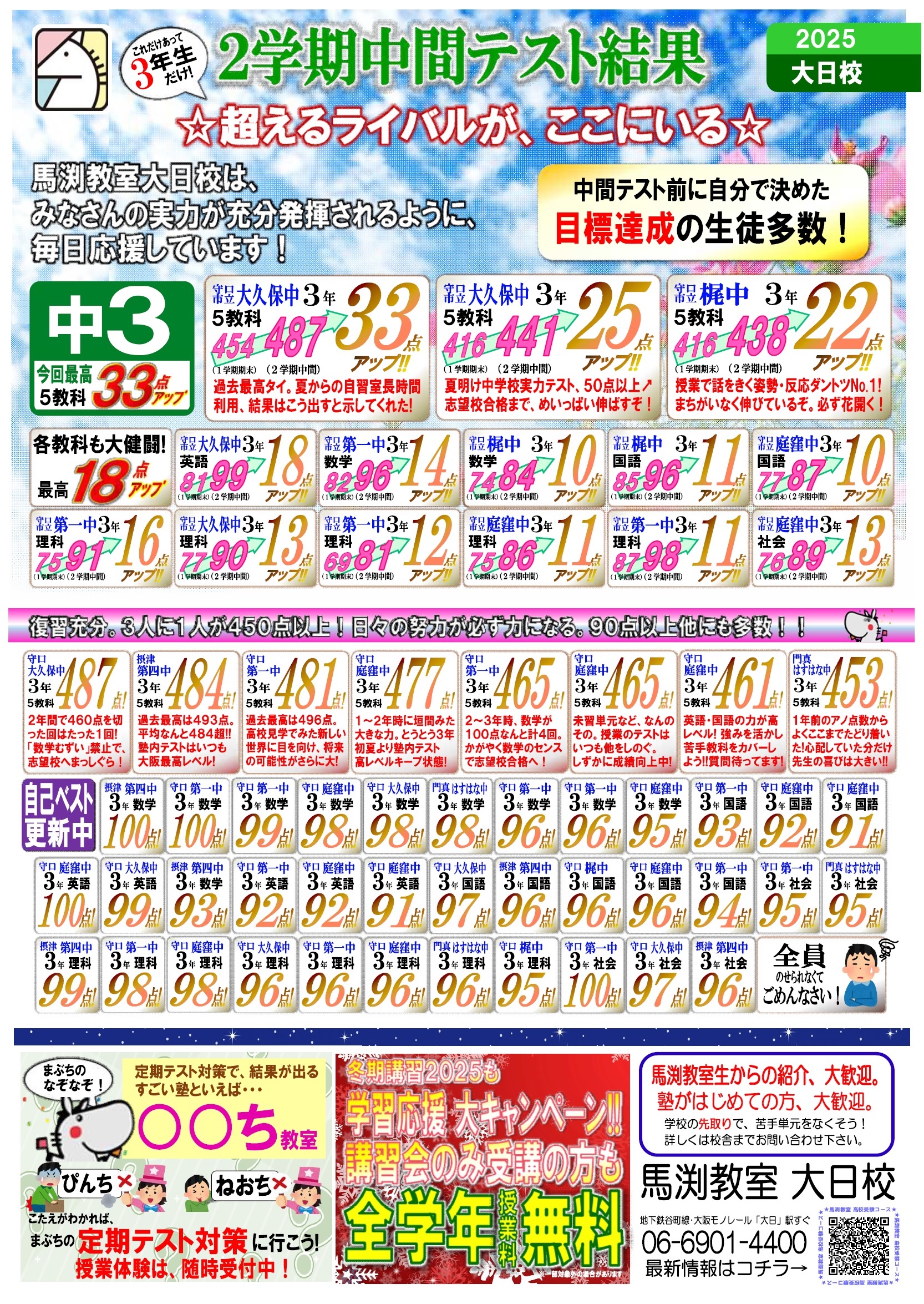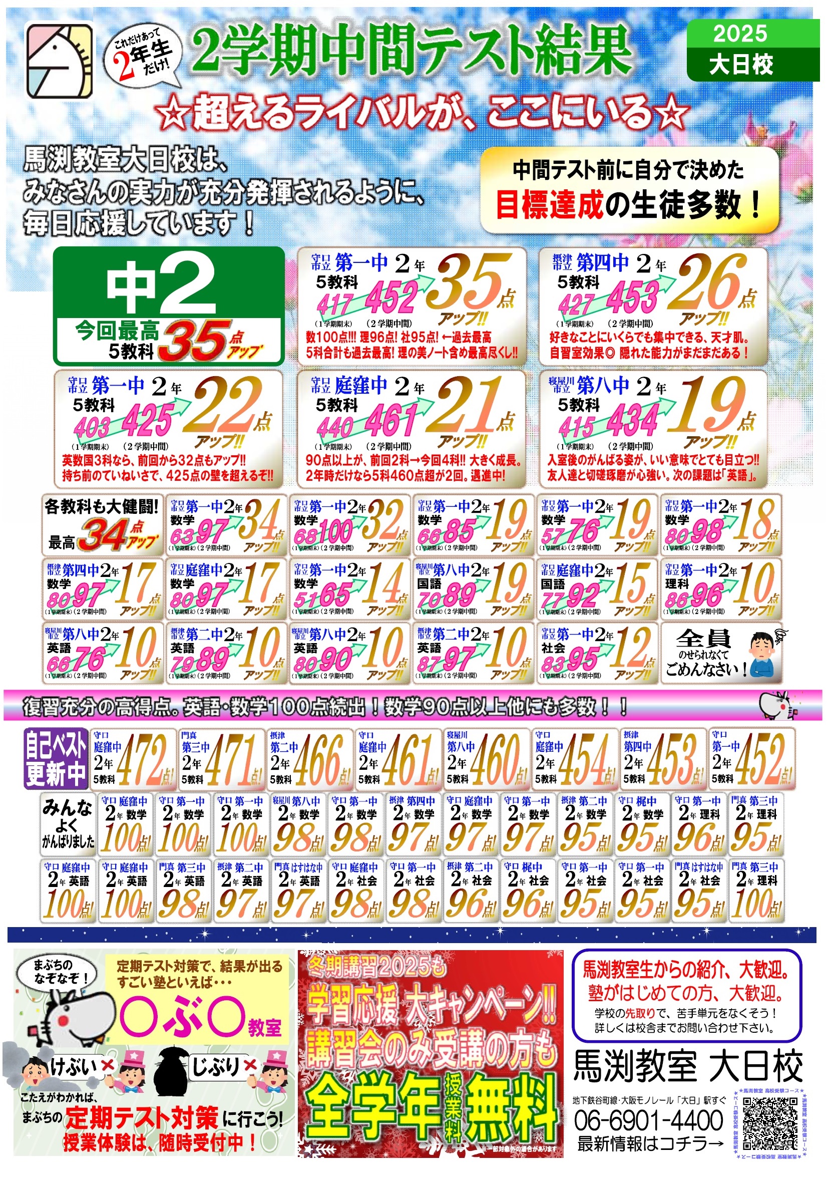 | 【中学生のみなさんへ】 2学期中間テスト/習熟テストはいかがでしたか? ◆準備充分、しっかり結果を出せた人 ◆前回からさらに伸び自信に満ちあふれている人 ◆苦手だった教科で高得点を出して またひとつ成長した人 ◆3教科は上がったけど 残り2教科でくやしい思いをした人 ◆テスト勉強は精一杯がんばったはずだけど 目標に届かなかった人 みんなよくがんばりました! そして、結果が良かった人もいまひとつだった人も、みんな気持ちをリセット! 過ごしやすい秋は新たなチャレンジの季節。 大きく成長できる大切な期間です。 また新たな目標に向かって、いっしょに勉強していきましょう!! ♪♫♪♫🌸♪♫♪♫🌸♪♫♪♫🌸♪♫♪♫🌸 ☆25年2学期中間/習熟テスト結果☆ (大日校単独実績) 期末テストにつなぐぞ! 今回のすばらしい結果を一部紹介。 【中3】 守口市立 中3 5教科487点!! 摂津市立 中3 5教科484点!! 守口市立 中3 5教科481点!! 守口市立 中3 5教科477点!! 守口市立 中3 5教科465点!! 守口市立 中3 5教科465点!! 守口市立 中3 5教科461点!! 門真市立 中3 5教科453点!! ☆点数アップも多数! 出た、中3で自己ベスト! このまま志望校につきすすめ! 守口市中3『5科33点アップ!!(487点)』 中3のこの時期でも、まだまだ伸びる! 守口市中3『5科25点アップ!!(441点)』 入室時からコツコツと、必ず結果を出す生徒! 守口市中3『5科22点アップ!!(438点)』) 摂津市立 中3 数学100点!! 守口市立 中3 数学100点!! 守口市立 中3 数学99点!! 門真市立 中3 数学98点!! 守口市立 中3 数学98点!! 守口市立 中3 数学98点!! 守口市立 中3 数学96点!! 守口市立 中3 数学96点!! 守口市立 中3 数学95点!! 守口市立 中3 英語100点!! 守口市立 中3 英語99点!! 守口市立 中3 国語97点!! 摂津市立 中3 国語96点!! 守口市立 中3 国語96点!! 守口市立 中3 国語96点!! 摂津市立 中3 理科99点!! 守口市立 中3 理科98点!! 守口市立 中3 理科98点!! 門真市立 中3 理科96点!! 守口市立 中3 理科96点!! 守口市立 中3 理科96点!! 守口市立 中3 理科96点!! 守口市立 中3 理科95点!! 守口市立 中3 社会100点!! 守口市立 中3 社会97点!! 摂津市立 中3 社会96点!! 門真市立 中3 社会95点!! 守口市立 中3 社会95点!! 【中2】 守口市立 中2 5教科472点!! 門真市立 中2 5教科471点!! 摂津市立 中2 5教科466点!! 守口市立 中2 5教科461点!! 守口市立 中2 5教科454点!! 摂津市立 中2 5教科453点!! 守口市立 中2 5教科452点!! 守口市立 中2 5教科449点!! 守口市立 中2 5教科437点!! 守口市立 中2 5教科434点!! ☆点数アップも多数! 1学期期末のときの悔しい思い、 ここにぶつけて大きく成長!! 守口市中2『5科35点アップ!!(452点)』 摂津市中2『5科26点アップ!!(453点)』 守口市中2『5科22点アップ!!(425点)』 守口市中2『5科21点アップ!!(461点)』 守口市立 中2 数学100点!! 守口市立 中2 数学100点!! 守口市立 中2 数学100点!! 守口市立 中2 数学98点!! 摂津市立 中2 数学97点!! 守口市立 中2 数学97点!! 守口市立 中2 数学97点!! 摂津市立 中2 数学95点!! 守口市立 中2 数学95点!! 守口市立 中2 英語100点!! 守口市立 中2 英語100点!! 門真市立 中2 英語98点!! 摂津市立 中2 英語97点!! 門真市立 中2 英語97点!! 門真市立 中2 理科100点!! 守口市立 中2 理科96点!! 門真市立 中2 理科95点!! 守口市立 中2 社会98点!! 守口市立 中2 社会98点!! 摂津市立 中2 社会96点!! 守口市立 中2 社会96点!! 守口市立 中2 社会95点!! 守口市立 中2 社会95点!! 門真市立 中2 社会95点!! 【中1】 摂津市立 中1 5教科464点!! 門真市立 中1 5教科463点!! 守口市立 中1 5教科459点!! 守口市立 中1 5教科443点!! 守口市立 中1 5教科441点!! 守口市立 中1 5教科431点!! 守口市立 中1 5教科431点!! 5教科中4教科アップ!! 守口市中1『5科17点アップ!!(386点)』 1学期中間から上がりっぱなし!! 守口市中1『5科16点アップ!!(459点)』 1学期中間からこの生徒も上がりっぱなし!! 守口市中1『5科12点アップ!!(420点)』 守口市立 中1 数学100点!! 摂津市立 中1 数学100点!! 守口市立 中1 数学97点!! 門真市立 中1 数学97点!! 守口市立 中1 数学96点!! 守口市立 中1 数学95点!! 門真市立 中1 英語100点!! 守口市立 中1 英語97点!! 守口市立 中1 英語95点!! 摂津市立 中1 英語95点!! 摂津市立 中1 国語95点!! 守口市立 中1 社会96点!! 摂津市立 中1 社会95点!! ※定期テストの結果は、 守口市立第一・庭窪・梶・大久保・八雲 門真市立門真はすはな・第二・第三・第五・第七 摂津市立第四・第二 寝屋川市立第五・第八・第九 の生徒のみなさんのものです。 ♪♫♪♫🌸♪♫♪♫🌸♪♫♪♫🌸♪♫♪♫🌸 馬渕教室では、 定期テスト2週間前から 中学校別に 対策授業を行います。 中学校の学習範囲に合わせて授業内容を切り替え。 事前に十分な対策をしてみなさんを応援します。 また、テスト前に各教科の目標も立てて、テスト後は目標達成できたかチェック! 次につないでいきます。 そして、馬渕教室大日校は、いっしょに目標に向かってがんばるあなたを待っています。 ☆☆☆☆☆☆☆☆☆☆☆☆☆☆☆☆☆ 【中学1年生】通常授業 英数2教科から受講ができます。 ※定期テスト2週間前から対策授業実施中! (受講例1)英数 2科 受講 授