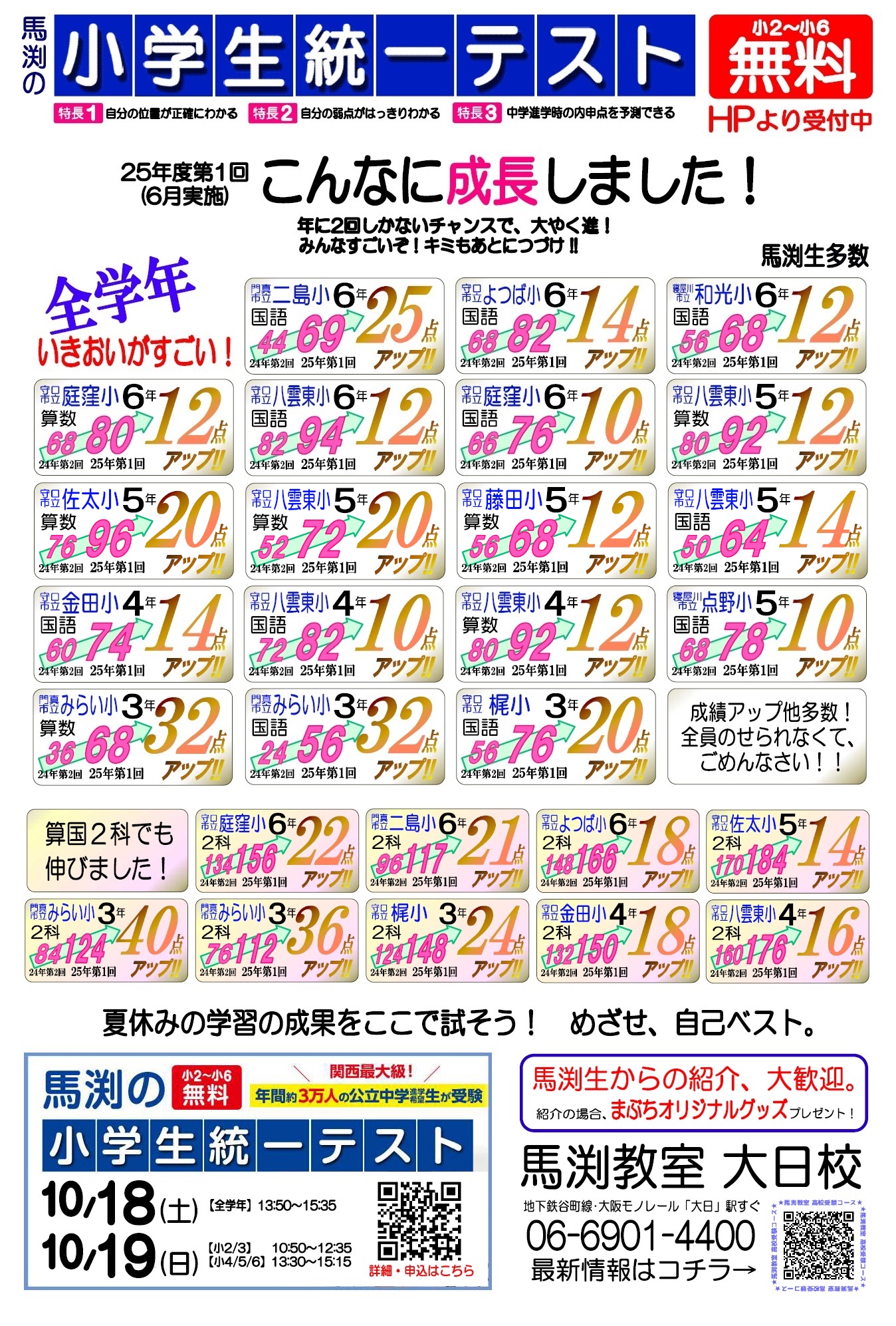 | 【受験してくれたみなさんへ】 お申し込みをありがとうございました! 普段の努力の成果はじゅうぶんに発揮されたでしょうか。 成績表の出るのが、約2週間後です。 成績表の準備ができ次第、各ご家庭に連絡いたします。 もうしばらくお待ちください。 ※小学生統一テストは、冬期講習準備テストを兼ねています。 冬期講習受講をご希望の方は、返却時にお申し込みできます。 【小学生統一テストとは】 (対象)小2~6 (小学生統一テストの特徴) ①自分の学力の位置が正確にわかる ②1問毎の正答確認で、弱点がはっきりわかる ③中学進学時の内申点を予測できる 🌸♪♫♪♫🌸♪♫♪♫🌸♪♫♪♫🌸♪♫♪♫🌸 ※2025年度は、小4/5/6年対象に 第3回小学生統一テスト(応用編) も実施!! 2026年1月24日(土)・25日(日) 詳細は、大日校までお問い合わせください。 🌸♪♫♪♫🌸♪♫♪♫🌸♪♫♪♫🌸♪♫♪♫🌸 【保護者の方へ】 ※小学生統一テストは、標準的な学習の習熟度・達成度をはかるものです。 また、学校とは違うお子様の立ち位置を確認いただけます。 自信につなげる、苦手克服のきっかけにする、などでぜひご活用ください。 大日校は、皆さんの力が十分発揮されるよう毎日応援しています! ※入室テスト(無料)は随時受付中!お申込はホームページから。 |
