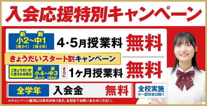 入室後1か月分の通常授業料が無料になります。(ご兄弟・ご姉妹同時にご入室の場合も適用)