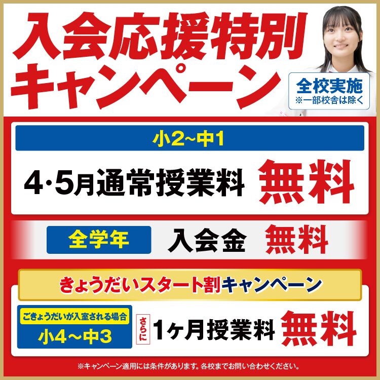 | 同時間入室テスト科目 | 新小4~新中1 算数・国語 新中2と新中3 英語・数学 新小2と新小3は算国合わせて30分 |