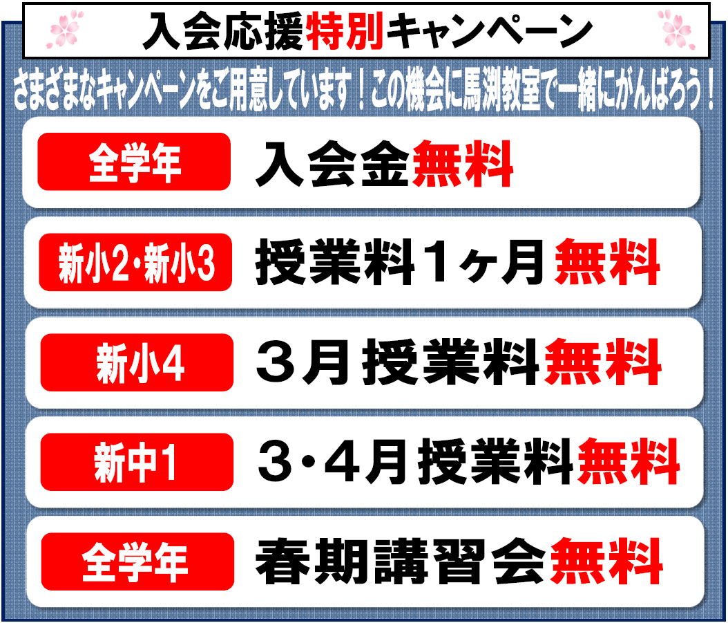馬渕の定期テスト対策![]() ![]() 定期テスト2週間前から定期テスト対策授業を実施!中学校別のクラスに分かれて、それぞれの定期テスト範囲に合わせて授業を実施します! 定期テスト対策オープン講座でぜひ体験してください! |