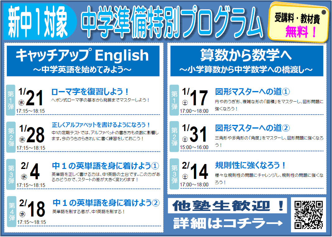 勉強の習慣を今から身につけて中学校生活をいい形でスタートしませんか??