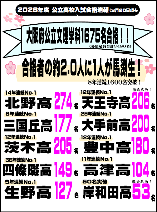Q:塾とクラブとの両立は可能ですか?A:馬渕教室の中学生の授業時間は原則19:15~21:40です。近くの中学校の部活動は夏時間で18:00くらいまでですので、クラブ活動を最後までしてから塾に来ることが可能です。 |
