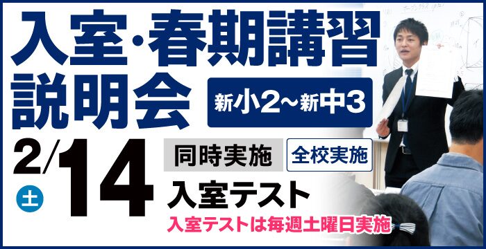 | ◆入室説明会のご案内◆ 2月14日(土)15:00~16:15 2月21日(土)13:00~14:15 2月28日(土)13:00~14:15 入室テストと同時実施! 説明会だけのご参加も可能です。 対象:新小4(現小3)~新中3(現中2)生 《内容》 ①「馬渕教室の理念と取り組み」 ②「成績を伸ばす馬渕の教育システム」 ③「オープンクラス(模擬授業) 算数・英語など」 お申込みは画像をタップ(クリック)♪ |