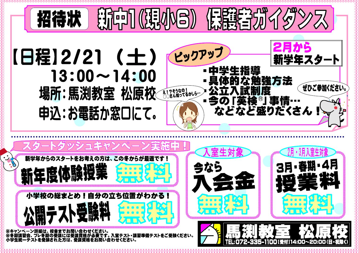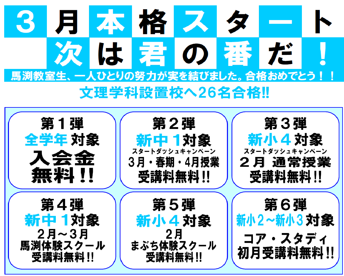 【2/14(土)15:00~16:20】入室テストを実施いたします。入室にあたり馬渕教室の指導方針やシステムなどの入室説明会も同時に実施しており、平日も随時行っております。ご都合が合わない場合は、校舎までご相談ください。なお入室を希望される方は、「入室テスト」の受験が必要です。