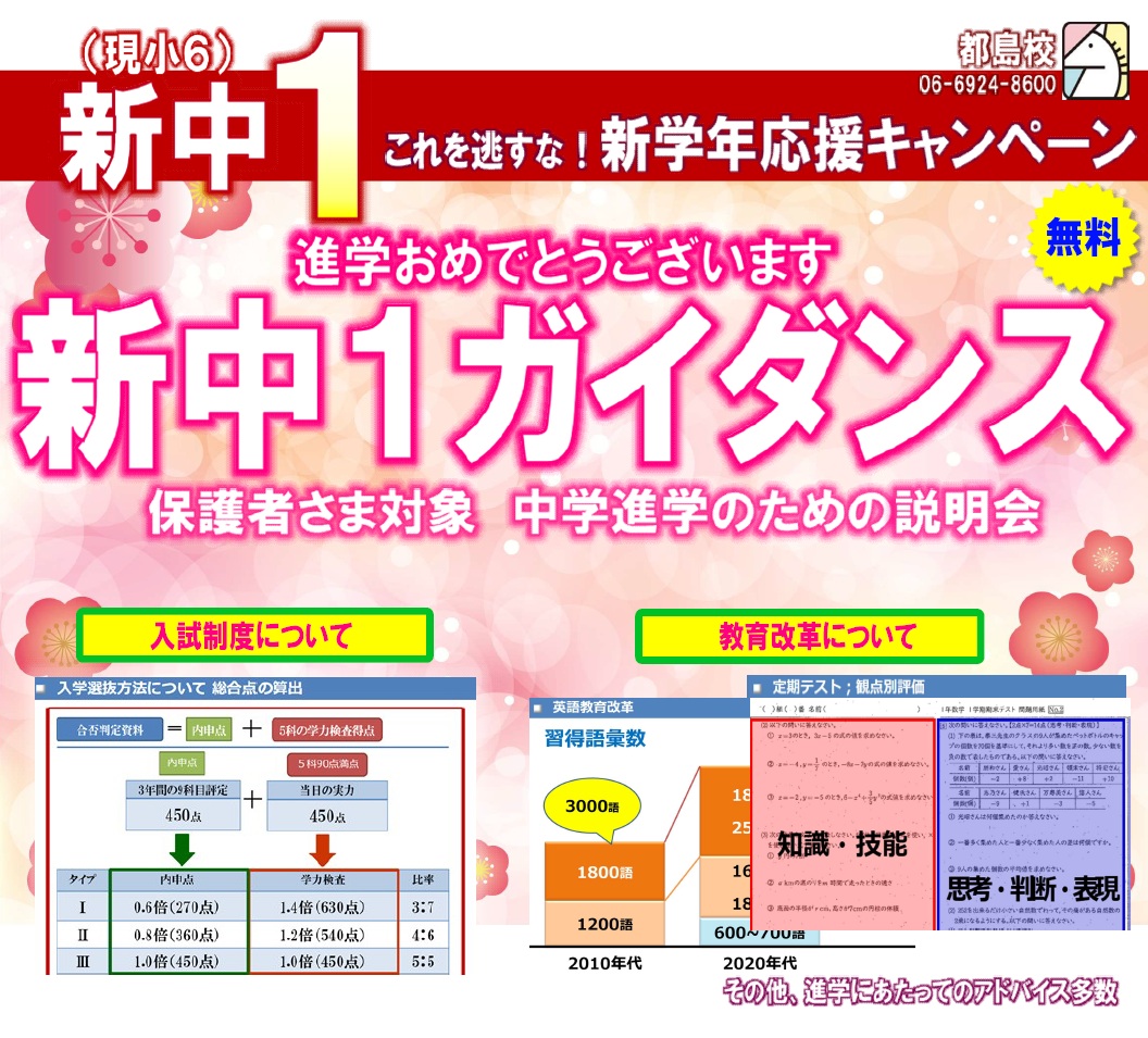 中学1年生5科合計 最高492点!!(友渕中)5科合計 平均430点OVER!!(友渕中5科受講者) 5科合計 平均440点OVER!!(都島中) 理科の受講者平均点 非受講者平均点より10点OVER!! 社会の受講者平均点 非受講者平均点より18点OVER!! |