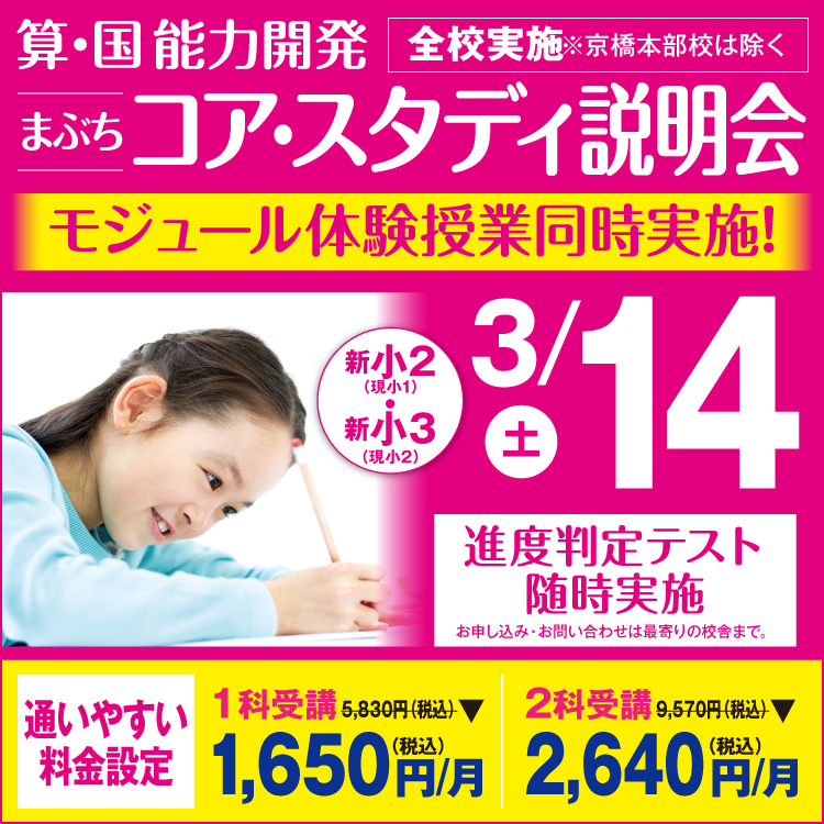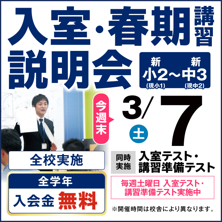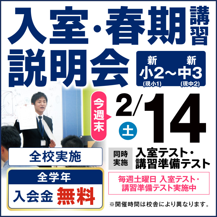 | 〇全学年:入会金無料 〇新小2・小3:授業料1か月無料!(ご入室された最初の1か月に適用できます。) 〇新小4:3月授業料無料!(2月からご入室の方のみ適用できます。) 〇新中1:3月・4月に加えて、春期講習会授業料無料!(2月からご入室の方のみ適用できます。) 〇新中3:日曜文理選抜コース3か月分授業料無料!(2月からご入室の方のみ適用できます。) 〇小4~中3:転塾応援制度あり。 詳しくは、校舎にお問い合わせください。 |