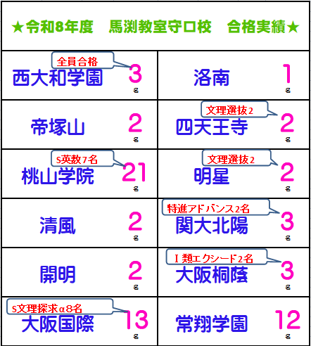 | 〇北野高校 6名 〇天王寺高校 5名 〇大手前高校 6名 〇四條畷高校 8名 〇寝屋川高校 2名 〇清水谷高校 1名 〇東高校 1名 〇いちりつ高校 1名 〇旭高校 1名 〇夕日丘高校 1名 他多数合格 上記合格実績は守口校出身の 京橋SSST移籍生を含みます |
