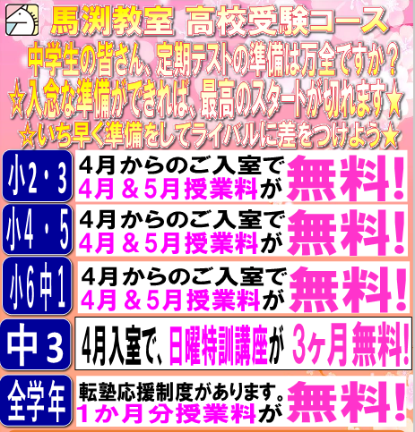 | 〇全学年:入会金無料 〇新小2・小3:4月・5月授業料無料!(4月からご入室の方のみ適用できます。) 〇新小4小5小6:4月・5月授業料無料!(4月からご入室の方のみ適用できます。) 〇新中1:4月・5月授業料無料!(4月からご入室の方のみ適用できます。) 〇新中3:日曜文理選抜コース3か月分授業料無料!(2月からご入室の方のみ適用できます。) 〇小4~中3:転塾応援制度あり。 詳しくは、校舎にお問い合わせください。 |