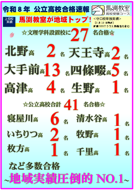 | 〇令和8年度守口校単独_公立合格実績 ・北野 2名 ・天王寺 2名 ・大手前 13名 ・四條畷 5名 ・高津 4名 ・生野 1名 文理学科に合計27名合格! ・寝屋川 6名 ・清水谷 1名 ・いちりつ 2名 ・牧野 1名 ・枚方 1名 ・千里 1名 など 公立高校に合計41名合格! (京橋SSSTクラス移籍生も含みます。) その他高校も多数合格。 守口校の生徒さんは、本当によく頑張ってくれました! |