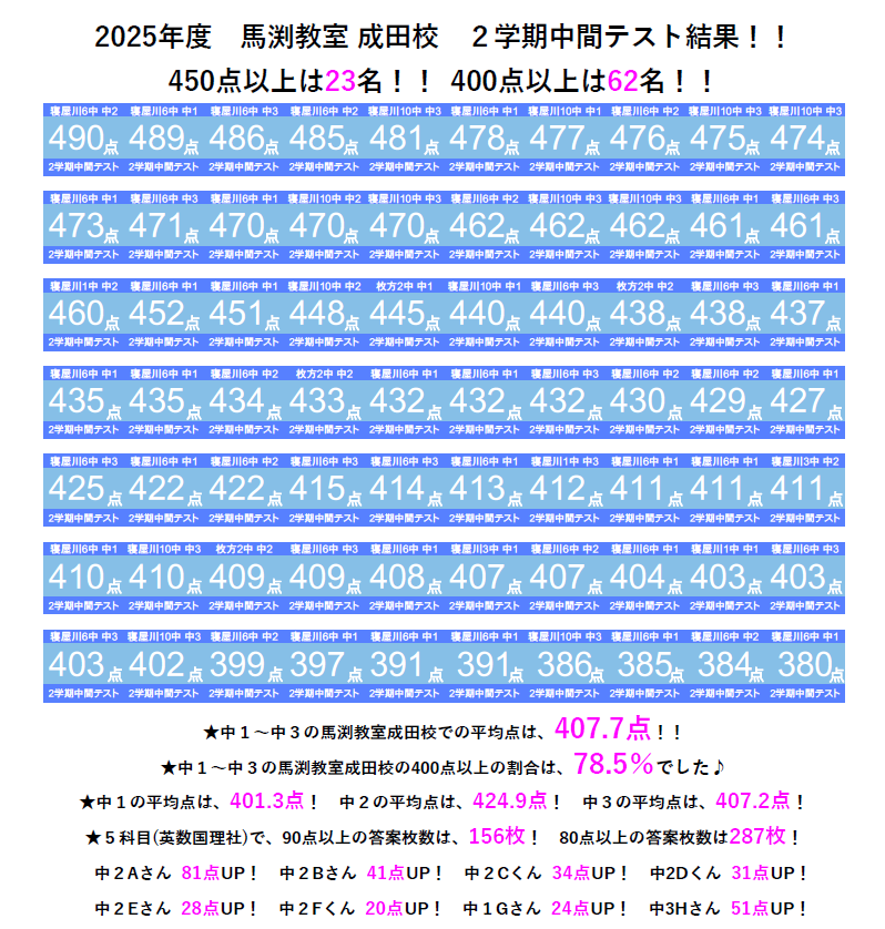 馬渕教室の平均点:401.3点(5科目)