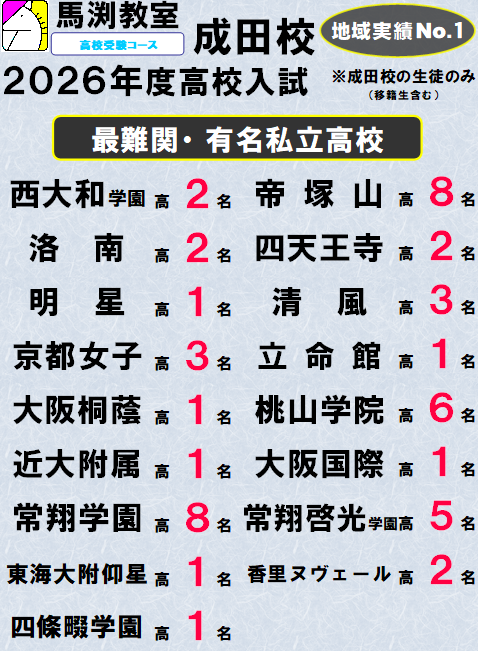 「高校入試結果 地域No.1」◀面倒見が良いから成績が上がる ▶ ◀成績が上がるから志望校に合格できる ▶ 今年の入試では、北野・天王寺・大手前・四條畷をはじめとした文理学科に14名が合格。 西大和・洛南といった最難関私立にも多数の合格者が生まれました。もちろん地域でNo.1の結果です。 ✿『分かりやすい授業』 ✿『集中できる自習室』 ✿『高校受験に完全対応のオリジナルテキスト』 ✿『切磋琢磨し合える仲間たち』 ✿『豊富な進路データ』 これら学習塾に必要なあらゆる要素が馬渕にはあります♪ |