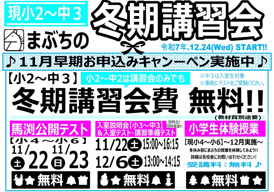 | 内容 | 1.馬渕教室が毎年高い合格実績を 出せる理由とは? 2.馬渕教室オリジナルの カリキュラム、テキストとは? 3.馬渕教室の授業とは? 英語と数学の教師が実演をします! |