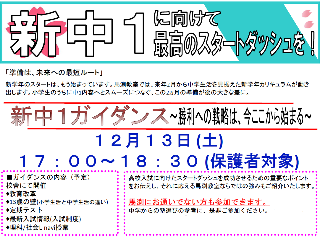 馬渕教室にご入室をお考えの方、塾選びをなされている方を対象とした説明会です。最新の受験事情を踏まえ、高校入試の現状をはじめ、馬渕教室の教育システム、教育理念の説明、模擬授業や馬渕のサポートコンテンツの紹介をさせていただきます。