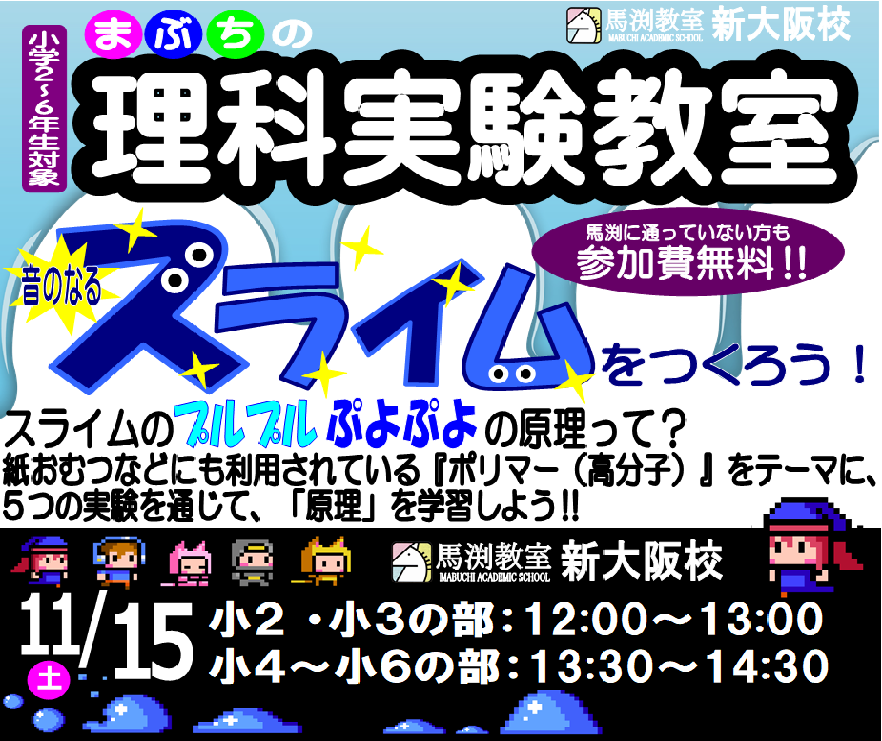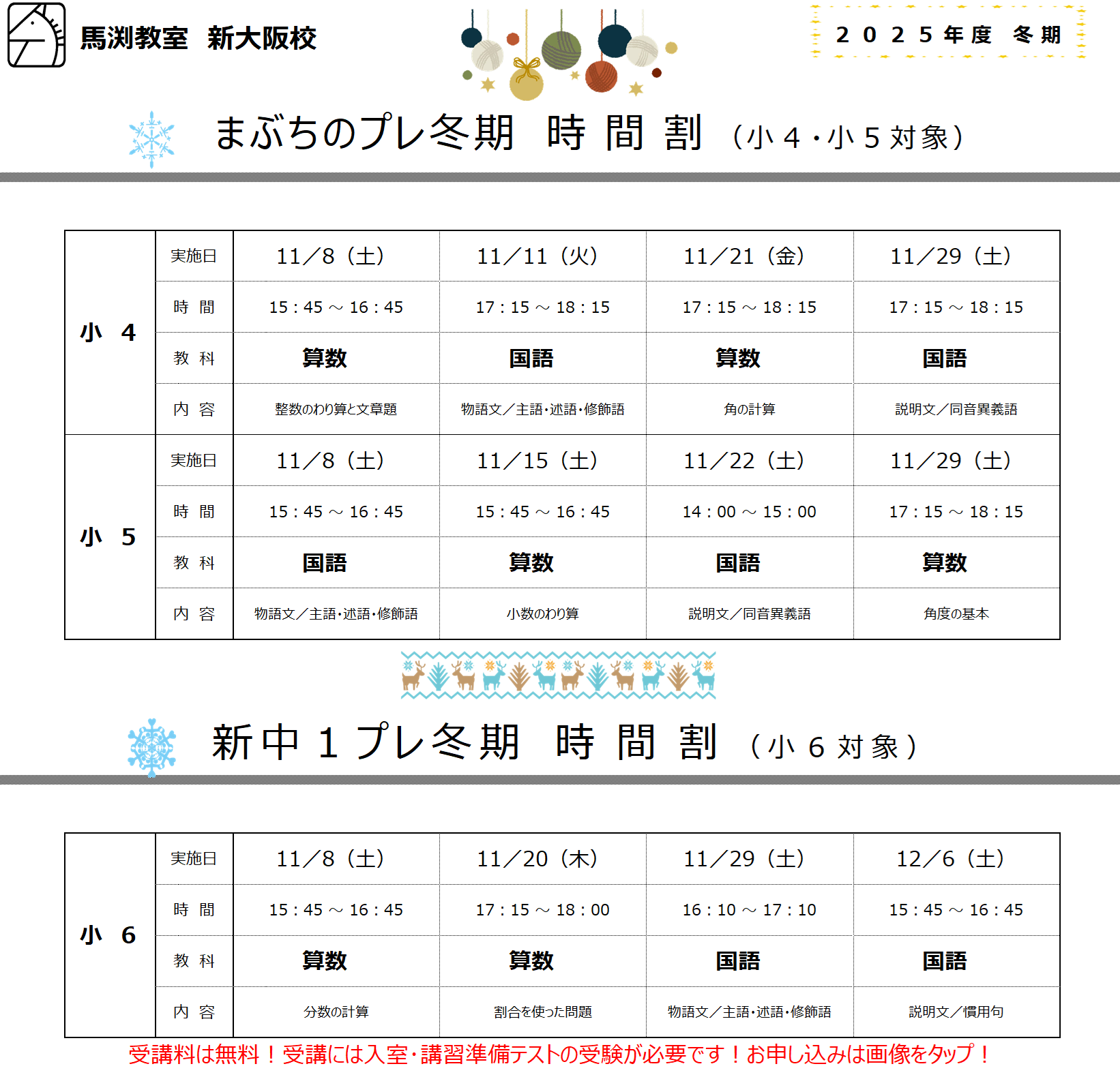 | 内容 | 「馬渕教室の理念と取り組み」 「最新の入試情報~共通テストから大阪府公立入試まで~」 「成績を伸ばす馬渕の教育システム」 「オープンクラス(模擬授業)算数・英語」 |