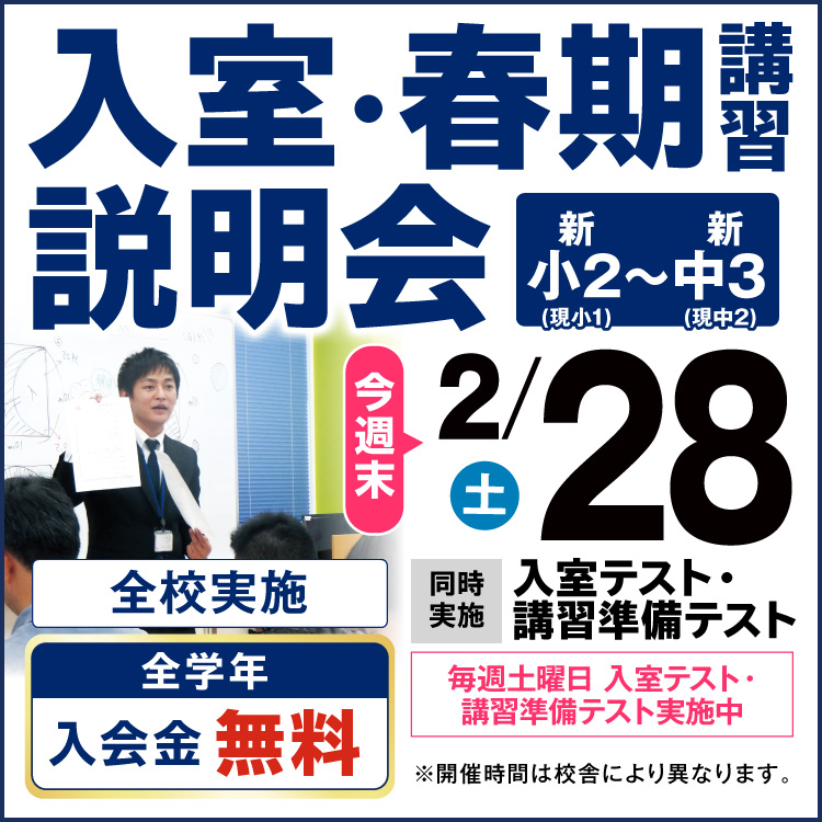 | 〇全学年:入会金無料 〇新小2・小3:授業料1か月無料!(ご入室された最初の1か月に適用できます。) 〇新小4:3月授業料無料!(2月からご入室の方のみ適用できます。) 〇新中1:3月・4月に加えて、春期講習会授業料無料!(2月からご入室の方のみ適用できます。) 〇新中3:日曜文理選抜コース3か月分授業料無料!(2月からご入室の方のみ適用できます。) 〇小4~中3:転塾応援制度あり。 詳しくは、校舎にお問い合わせください。 |