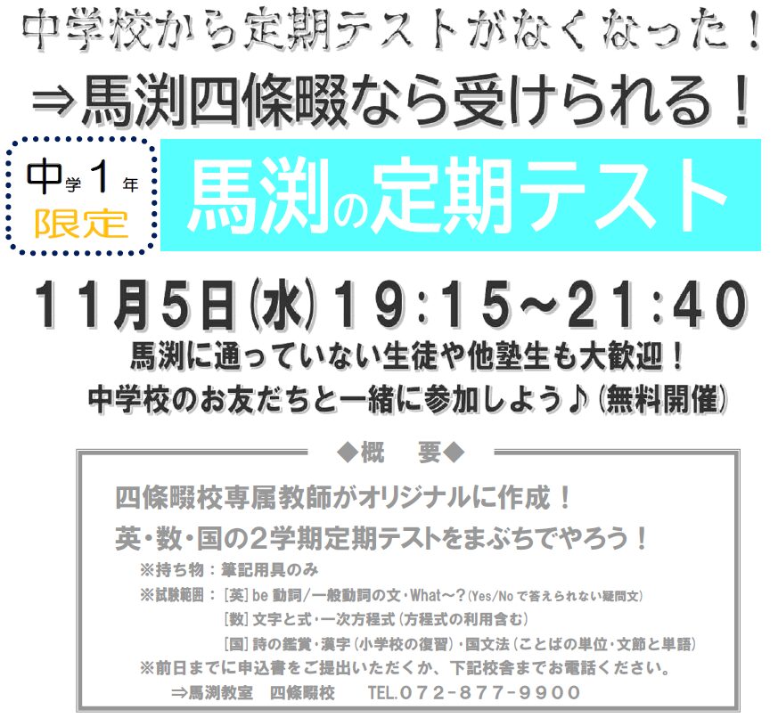一部の中学校では、中間・期末考査といった“定期テスト”がなくなっています。小学校の延長である単元/課題テストで代用している中学校がいくつかあります。残念ながら、定期テストが「ある中学」「ない中学」では、学力に大きな差がついているのが現実です。そこで、馬渕教室の指導方針の1つである“教育活動を通しての地域貢献”の一環として、四條畷校では定期テストを実施いたします。学校教科書レベルと範囲に応じて、校舎専属教師によるオリジナル問題作成『馬渕なら定期テストが受けられる!』初めての生徒さんも無料でご受験いただけます。奮ってのご参加、お待ちしています!