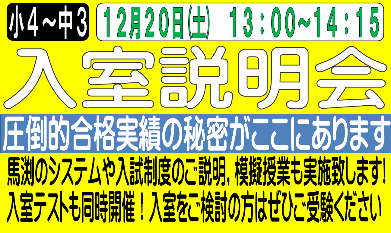 馬渕教室へ入室を希望される方は、「入室テスト」を受験して入室資格を取得してください。受験には事前のお申し込みが必要です。校舎までお電話いただくか校舎窓口にてお申し込みください。