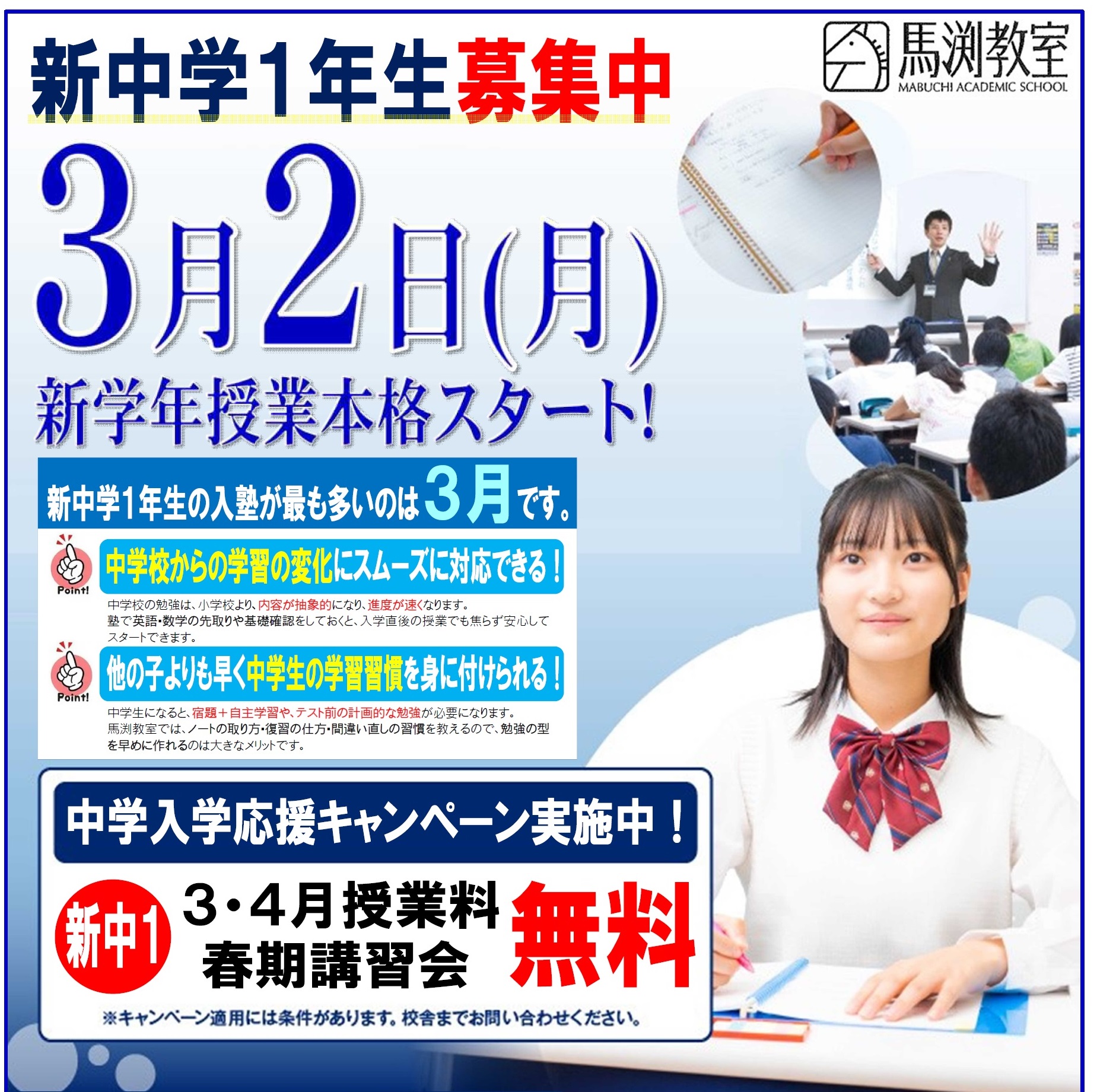 A:馬渕教室ではご入室の際に入室テストを受験していただいています。このテストにおいて、受講資格を得られた方は、馬渕教室の授業に十分ついていける学力をお持ちです。入室前に未習単元がある場合やつまづいた単元や分からない問題などは随時質問対応や宿題サポートWebにてフォローします。受講資格を得られた場合は安心して馬渕教室に入室してください。勉強や部活 ・習い事などめいっぱい頑張る皆さんを馬渕教室は全力で応援します。