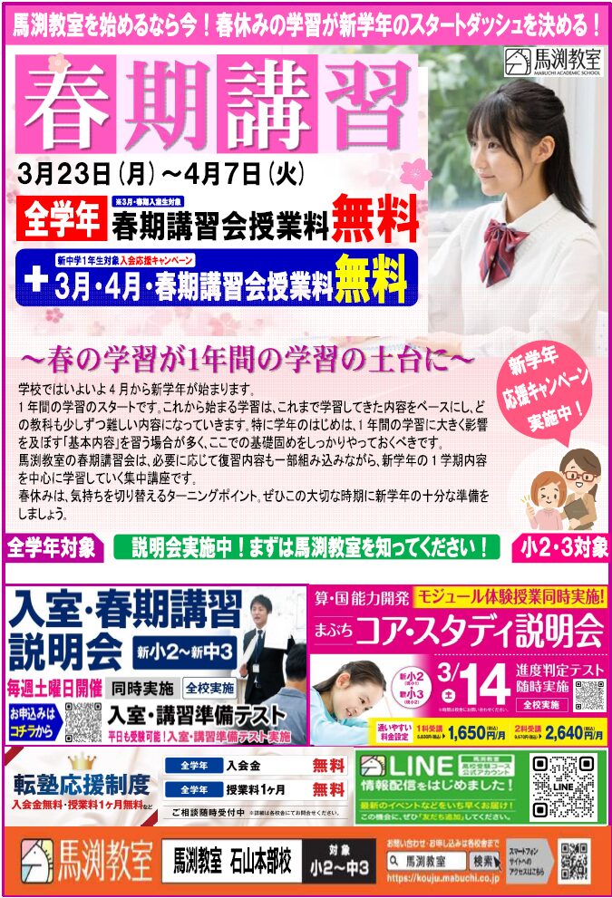 馬渕教室石山本部校では、小中学生の学習をサポートする体制が整っております。お気軽にご参加ください。