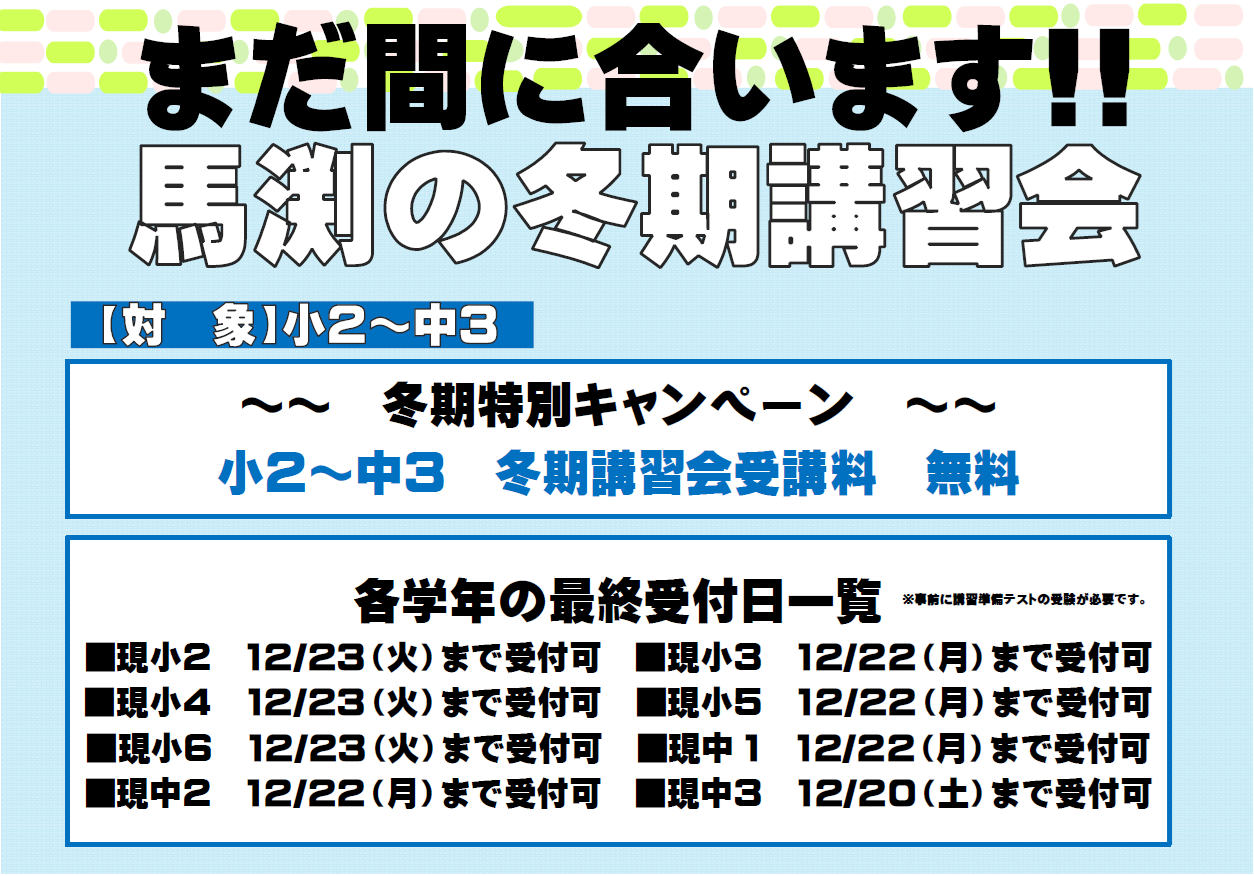 ぜひともお友達もお誘い合わせのうえ、馬渕教室の冬期講習会にご参加ください!