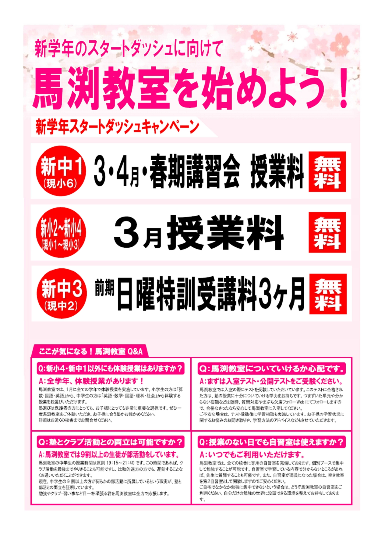 A:馬渕教室ではご入室の際に学力診断テストを受験していただいています。このテストにおいて、受講資格を得られた方は、馬渕教室の授業に十分ついていける学力をお持ちです。入室前に未習単元がある場合やつまづいた単元や分からない問題などは随時質問対応や宿題サポートWebにてフォローします。受講資格を得られた場合は安心して馬渕教室に入室してください。勉強や部活 ・習い事などめいっぱい頑張る皆さんを馬渕教室は全力で応援します。